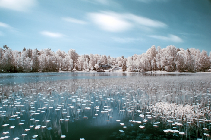 Direkt från kameran kommer din bild dock att visa röda toner och den här typen av fotografering kräver ofta således bearbetning i något bildbearbetningsprogram. Många fotografer jobbar då med färgkanaler där rött och blått ofta "byter plats" vilket skapar det drömska landskap som bilden ovan visar.