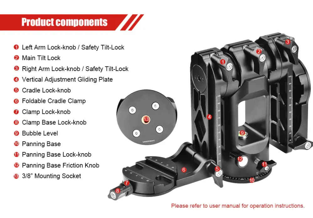 ● Flexibel och exakt justering - Oberoende armjustering, vertikal glidplatta och mångsidiga låsknappar ger dig full kontroll över kamera- och objektivpositionering. Du kan enkelt anpassa höjd, lutning och balans för varje situation.
